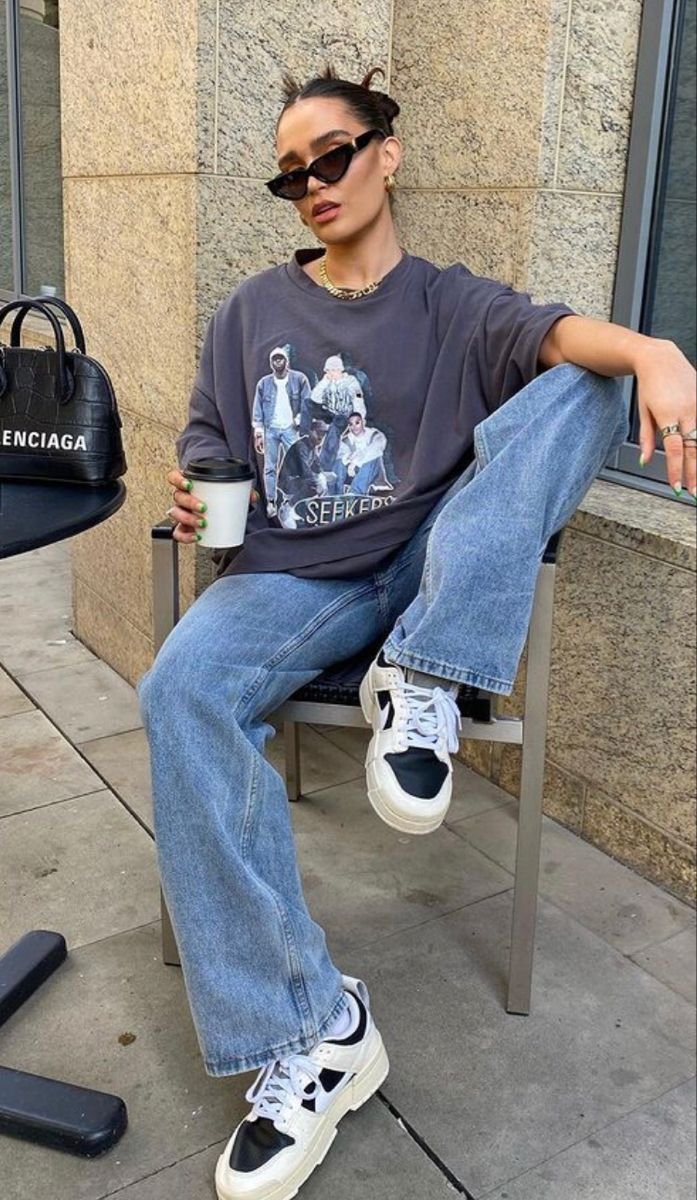 Baggy denim styled with a tiny baby tee is peak ‘90s energy. Add platform sneakers or combat boots to balance the proportions. This is one of those back-to-school outfit ideas that feels casual but instantly on-trend.