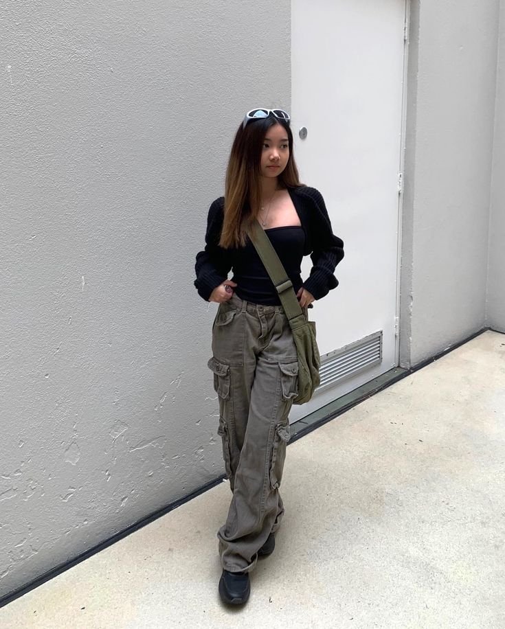 The cropped cardigan trend isn’t slowing down. Throw one over a basic tank and pair it with cargo pants for a look that’s equal parts cozy and cool. A mini shoulder bag ties it together and makes it feel intentional, even if you dressed in five minutes.