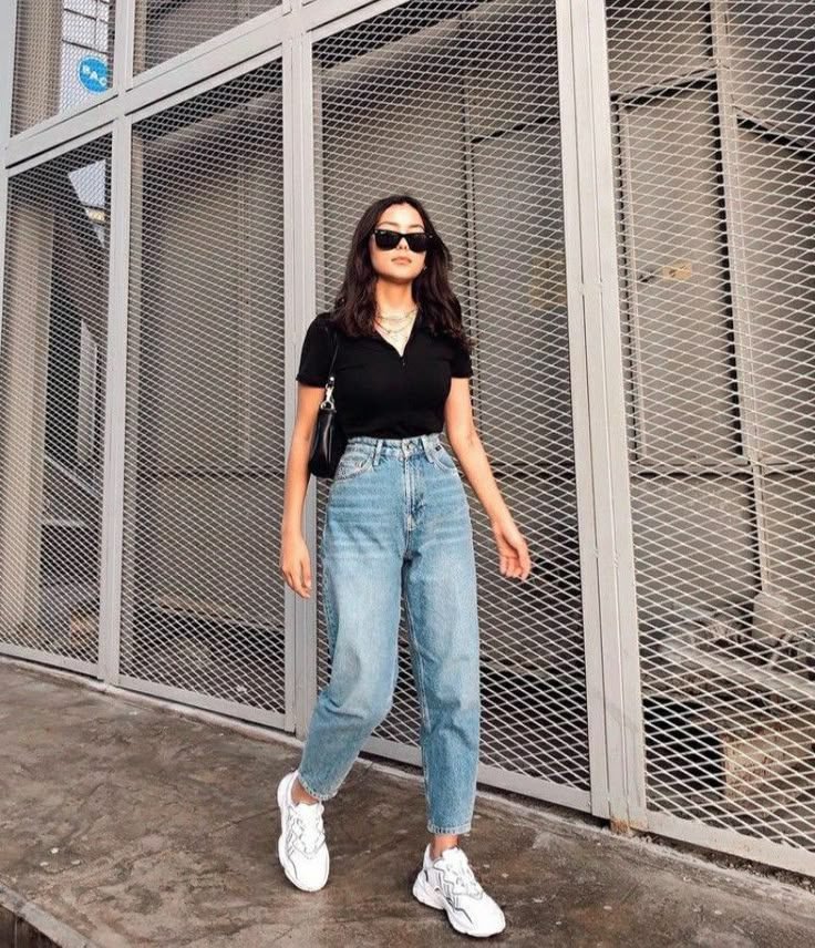 An oversized blazer over mom jeans instantly makes you look more polished. Add a tank or fitted tee underneath and finish with loafers or sneakers. This outfit works for lecture halls and coffee runs without feeling too formal.