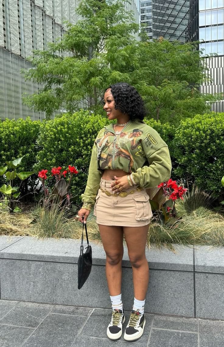 Cargo skirts are everywhere right now, and they’re easy to style. Throw on an oversized hoodie and chunky sneakers for a relaxed, sporty vibe. It’s a look that works for lectures, study sessions, or grabbing lunch with friends.