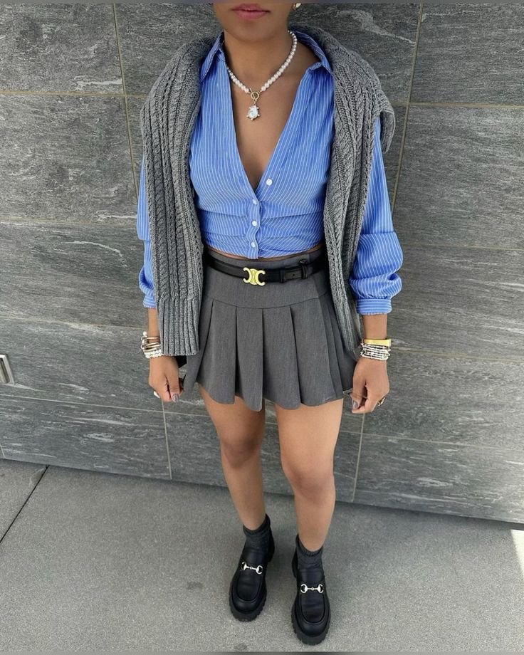 A pleated skirt paired with a crisp button-up is a classic preppy fit. Keep it playful with sneakers or elevate it with loafers. Add a cropped sweater draped over your shoulders for that extra polished touch.