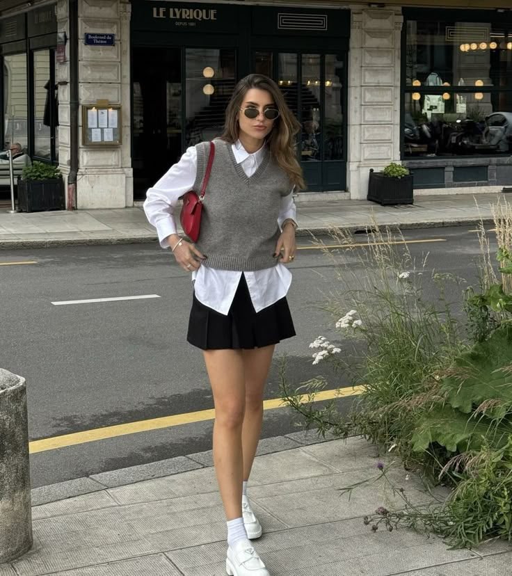 The sweater vest trend is made for school hallways. Layer it over a collared shirt and style with tailored trousers or a mini skirt. It gives off effortless prep energy without looking too serious.