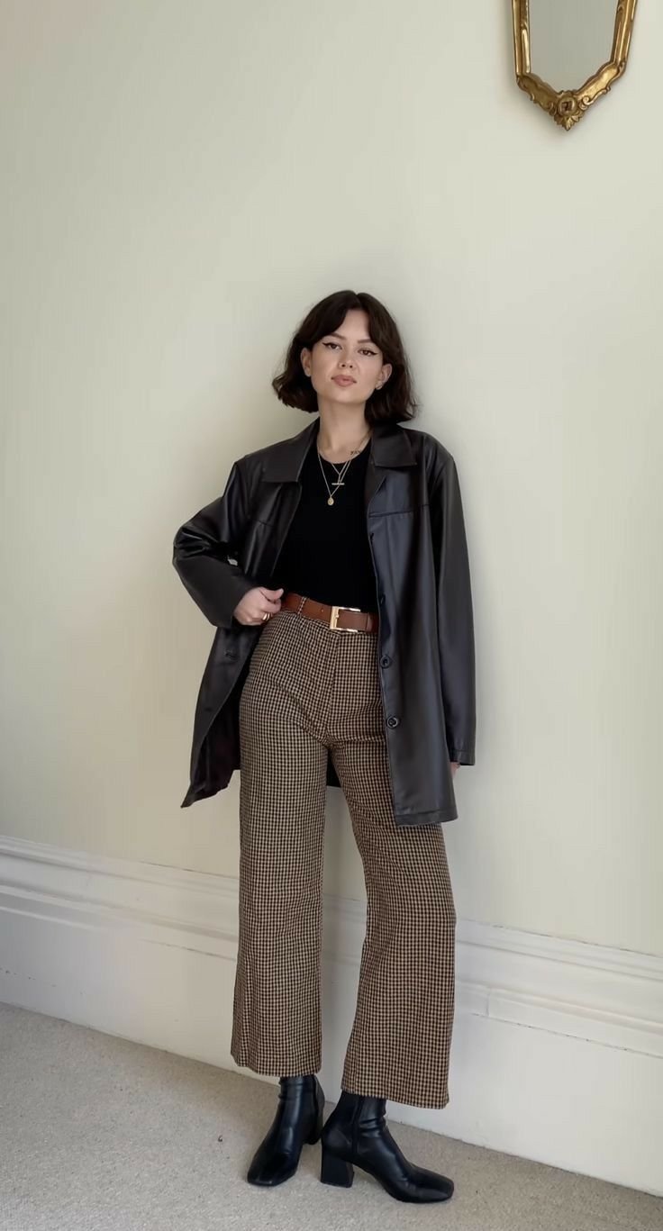 Plaid pants instantly lean preppy. Add a fitted tee and a structured blazer, then finish with loafers or ankle boots. This outfit looks sharp but still relaxed enough for everyday classes.