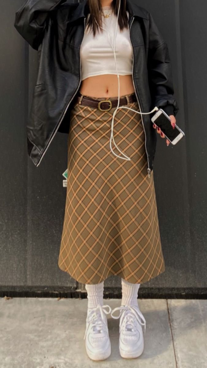 A leather jacket over a midi skirt creates an edgy-meets-feminine balance. Keep the top simple—a tank or slim-fit tee works best. It’s an outfit that works for campus, study groups, and even post-class coffee runs.