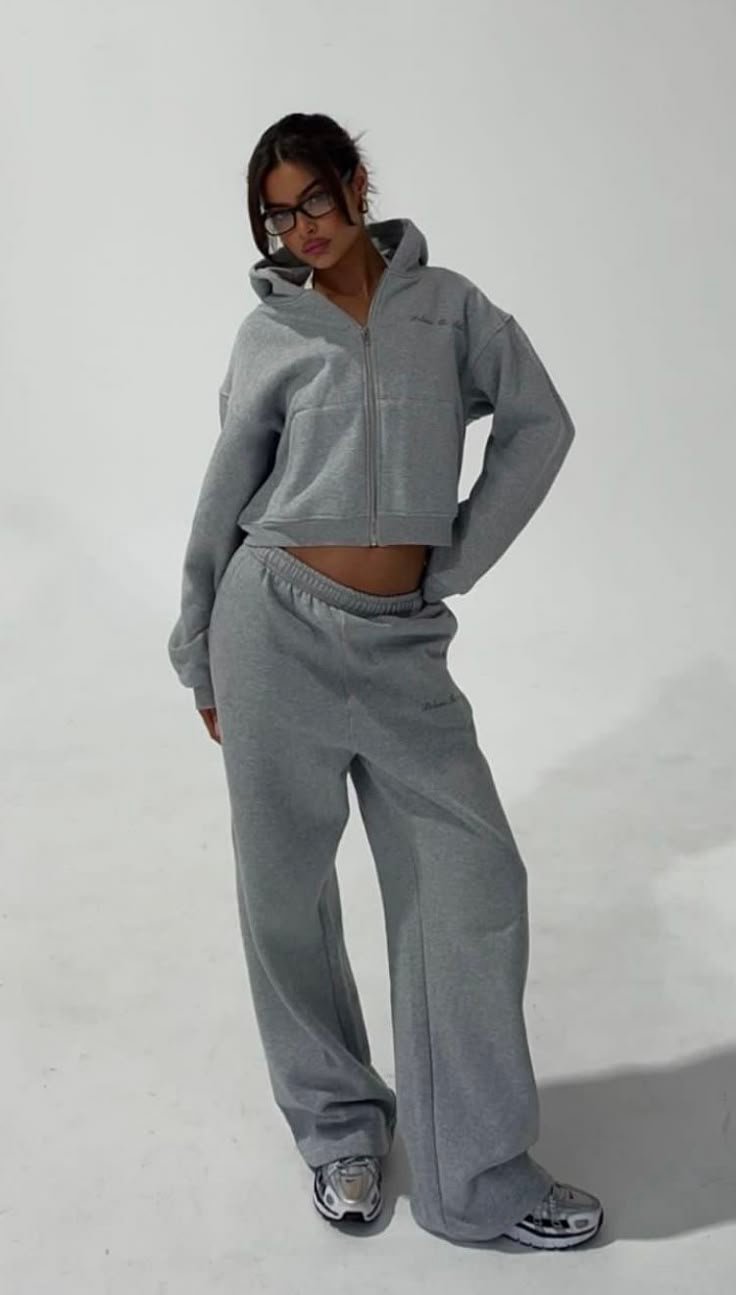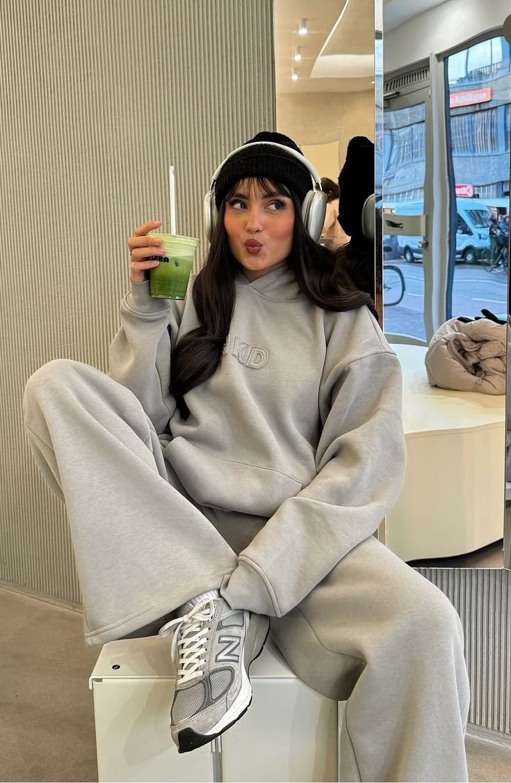 Matching sweats make you look pulled together, even when you’re not trying. A neutral sweat set paired with statement sneakers feels relaxed but polished. This is one of those back-to-school outfits for girls that always works when you need a quick option that still looks on-trend.