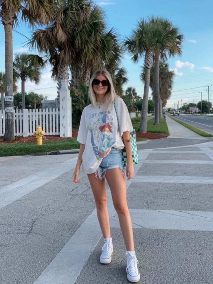 You can never go wrong with a white tee and denim shorts. Add high-top sneakers or low-profile Vans, and the outfit feels instantly put together. This one works best for warm-weather school days.