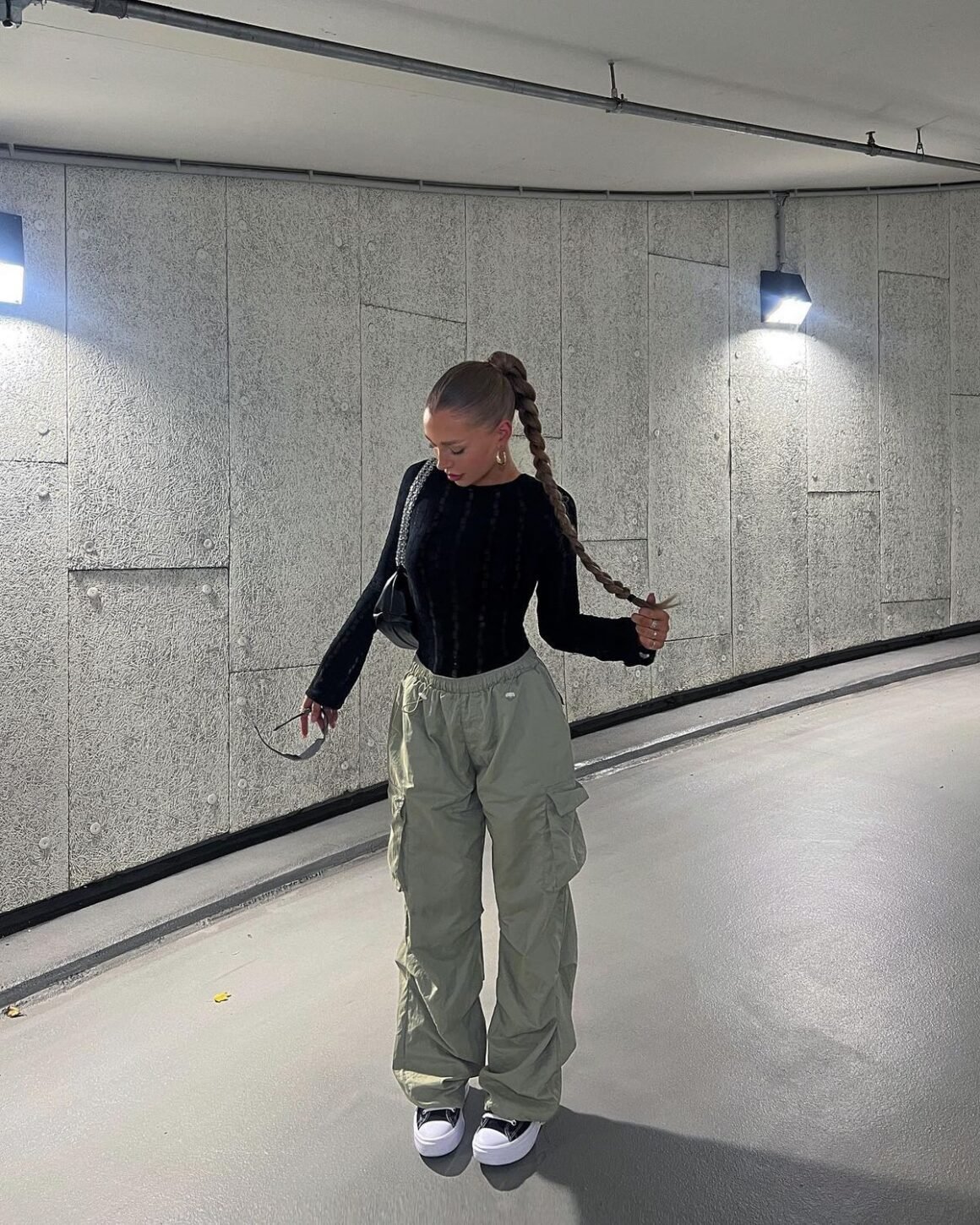 Parachute pants are a statement on their own. Pair them with a simple tank bodysuit to keep the look balanced. Add chunky sneakers or slides, and you’ve got an outfit that feels comfortable enough for back-to-back classes but still on-trend.