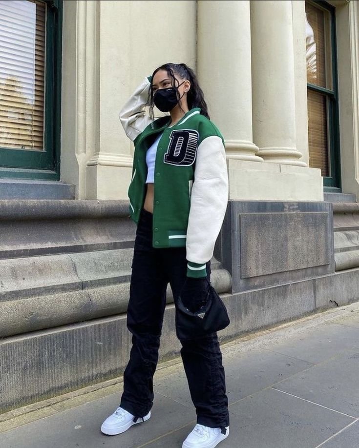 The varsity jacket is high school energy in one piece. Wear it over a plain tee with black jeans and sneakers. It’s the kind of outfit that makes you feel like you walked straight out of a teen drama.